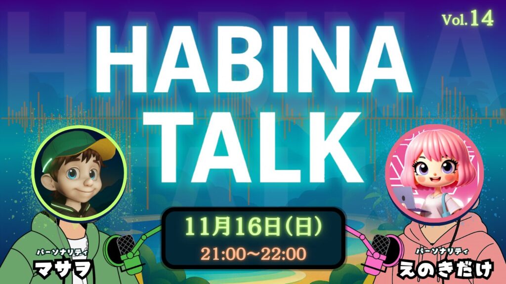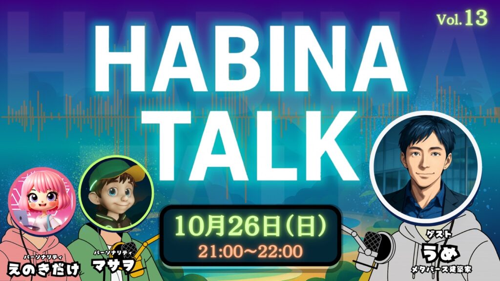 はじめに:メタバースは単なるツールではなく、新しい繋がりの場 2024年11月16日に配信された「HABINA TALK」第14回では、パーソナリティのマサヲ君とえのきだけが、メタバースを活用した新しいコミュニティづくりとビジネスの可能性について熱く語り合い... -
