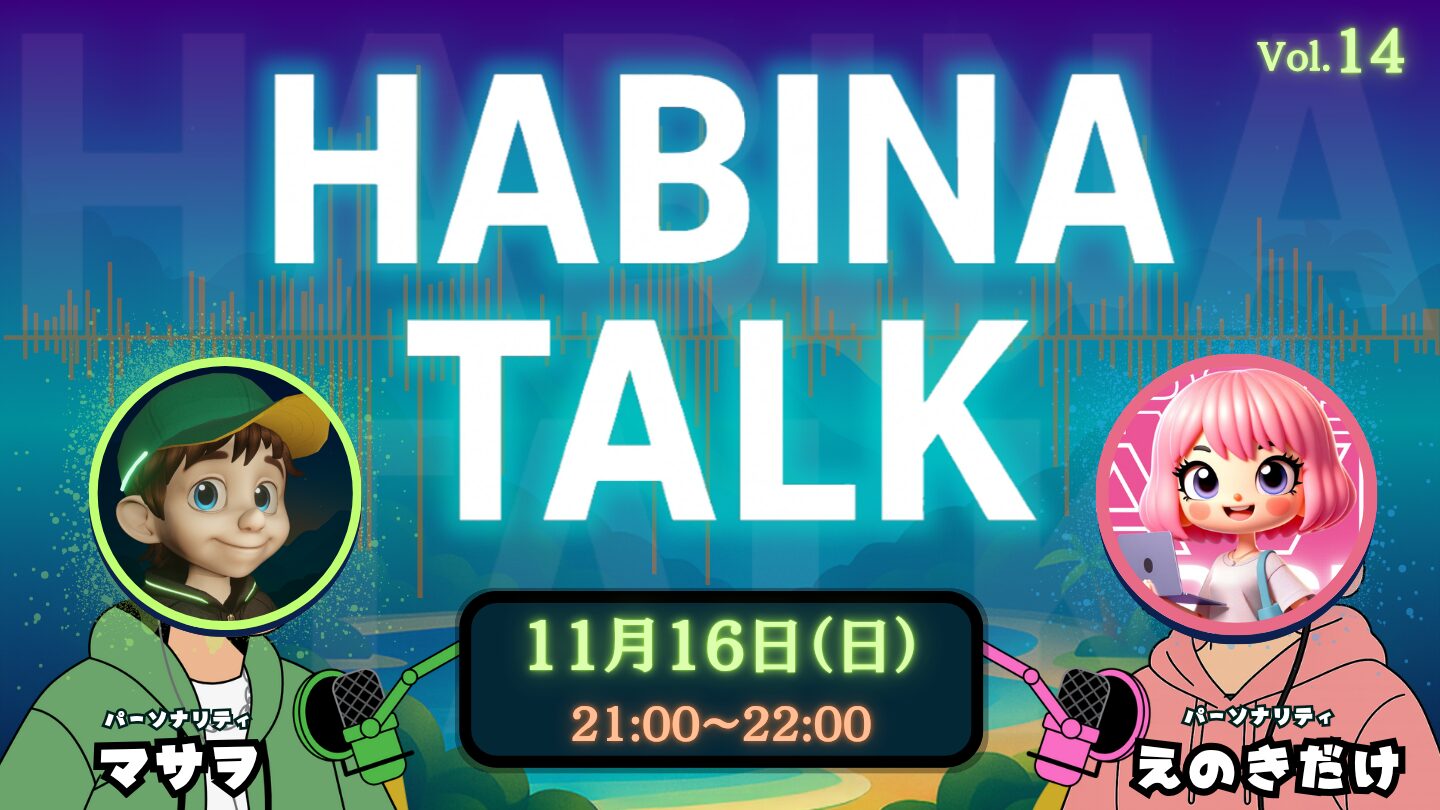 2024年11月16日に配信された「HABINA TALK」第14回では、パーソナリティのマサヲ君とえのきだけが、メタバースを活用した新しいコミュニティづくりとビジネスの可能性について熱く語り合いました。