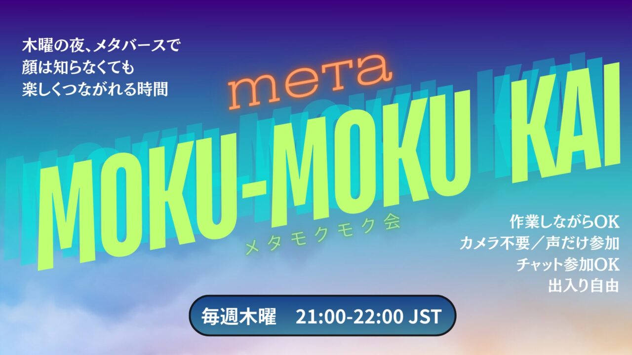 「メタバースもくもく会」は、各自がやりたい作業を持ち寄って静かに集中したり、合間に雑談や相談でゆるく交流したりできるオンライン作業会です。